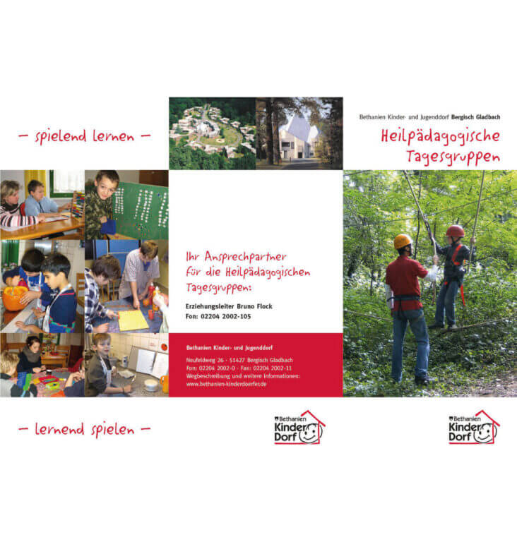 Der Informationsflyer zur den Heilpädagogischen Tagesgruppen liefert explizit Informationen zu den Leistungen und dem Angebot der HPT im Kinderdorf in Bergisch Gladbach.