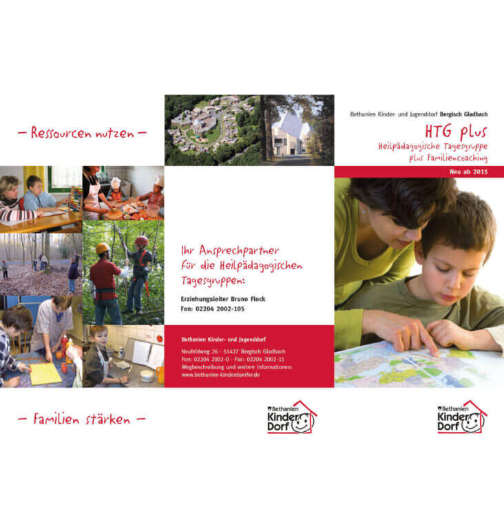 Der Informationsflyer zur den Heilpädagogischen Tagesgruppen Plus liefert explizit Informationen zu den Leistungen und dem Angebot der HPT plus im Kinderdorf in Bergisch Gladbach. Die HTG Plus unterscheidet sich durch ein zusätzliches Familiencoaching von der regulären HTG.