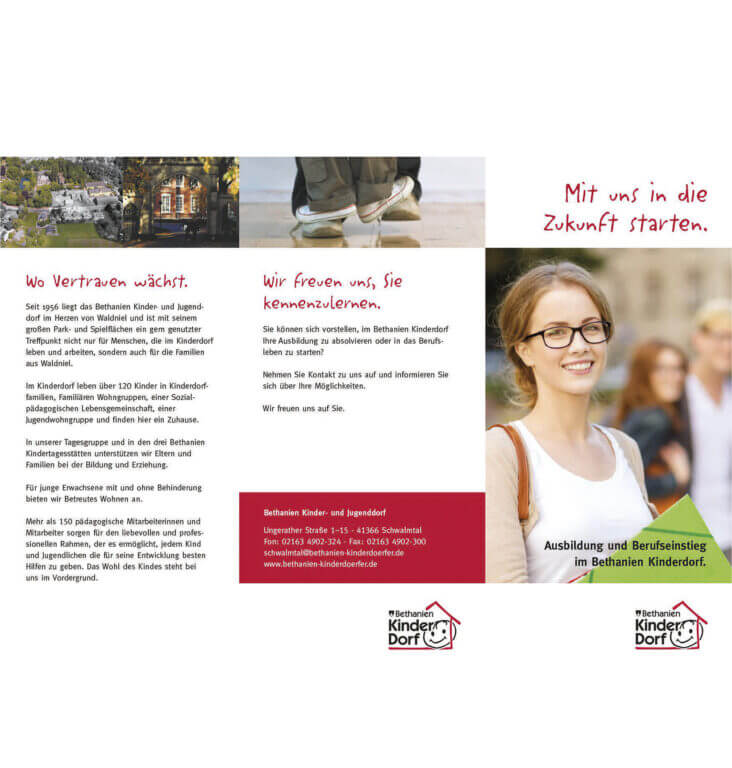 Der Flyer Mit uns in die Zukunft starten gibt Informationen zur Ausbildung und zum Berufseinstig im Bethanien Kinderdorf. Er richtet sich an Schüler, Auszubildende und Studenten.