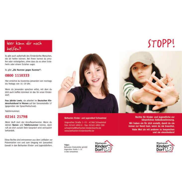 Der Flyer STOPP! richtet sich an Kinder und Jugendliche und erklärt die Rechte zur körperlichen Selbstbestimmung. Er ist in Zusammenarbeit mit dem Kinderschutzbund in Bergisch Gladbach entstanden. Er eignet sich auch zur Weitergabe an Schulklassen oder Kinder- und Jugendgruppen.
