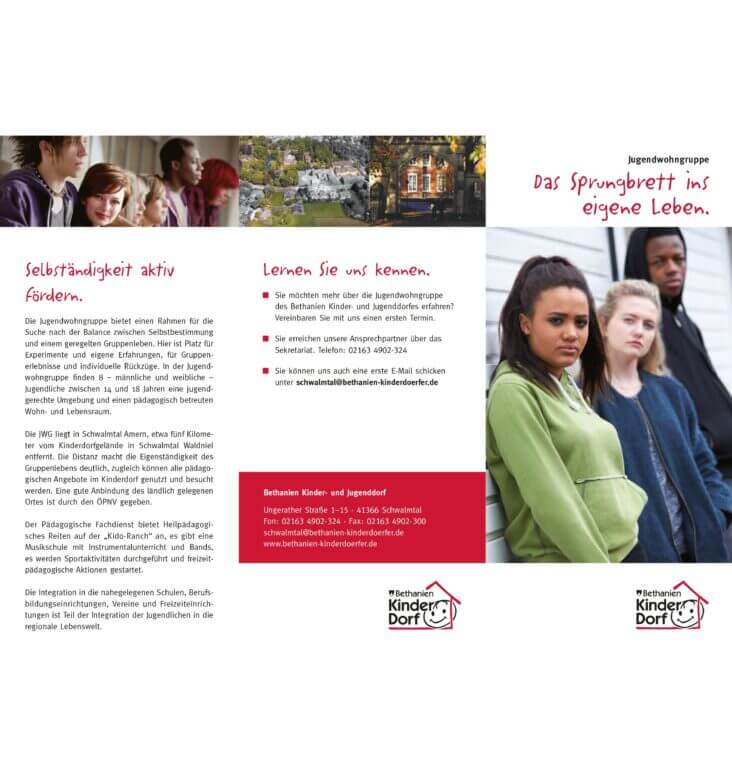 Der Informationsflyer zur Jugendwohngruppe liefert explizit Informationen zu den Leistungen der Jugendwohngruppe im Kinderdorf in Schwalmtal.