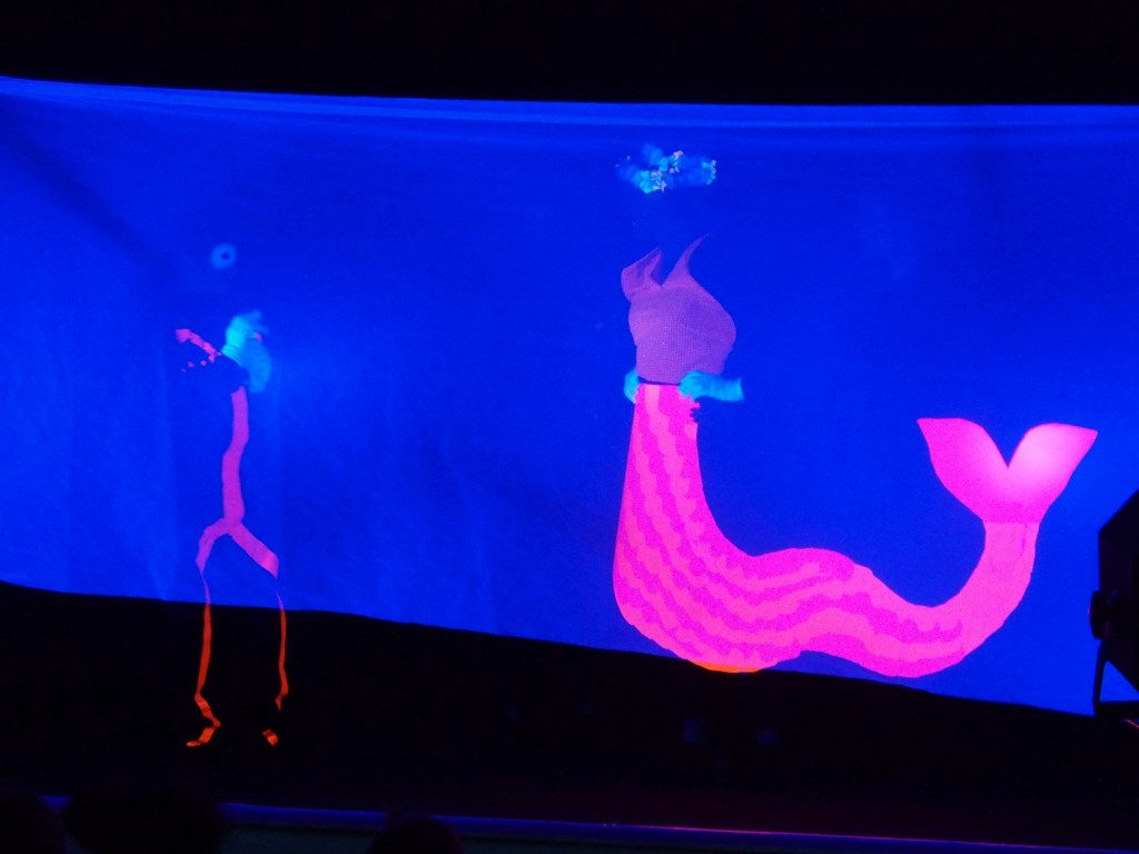 Abschlusspräsentation des Theater-Camp in der Aula des Bethanien Kinderdorf Eltville: "Ja, Mann!" im Schwarzlichttheater dank der Unterstützung des Fördervereins