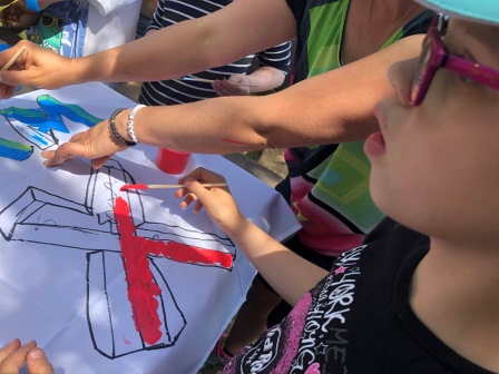 Eine Herausforderung war der „Katapultbau“. Verschiedene Materialien wurden zur Verfügung gestellt. Gut ausgestattet machten sich alle an ihr Werk. Unter Zeitvorgabe sollte eine einsatzfähige Katapultanlage konstruiert werden. Eine echt knifflige Aufgabe für das ein oder andere Team. Manch ein Tüftler-Team ging in der gestellten Aufgabe richtig auf. Der Ehrgeiz hatte alle gepackt. Schließlich wurde zum Abschluss gemessen, welcher Ball möglichst weit geschleudert werden konnte. Besonders erfolgreich und zufrieden zeigte sich das Team von David: „Wir freuen uns, den Wurf-Contest zu gewinnen. Unser Konstrukt ist uns wirklich gelungen.“ Die Kleineren hatten große Freude bei der Gestaltung ihres eigenen Team-Wappens. So konnte jedes Team eine eigene Fahne mit nach Hause nehmen.