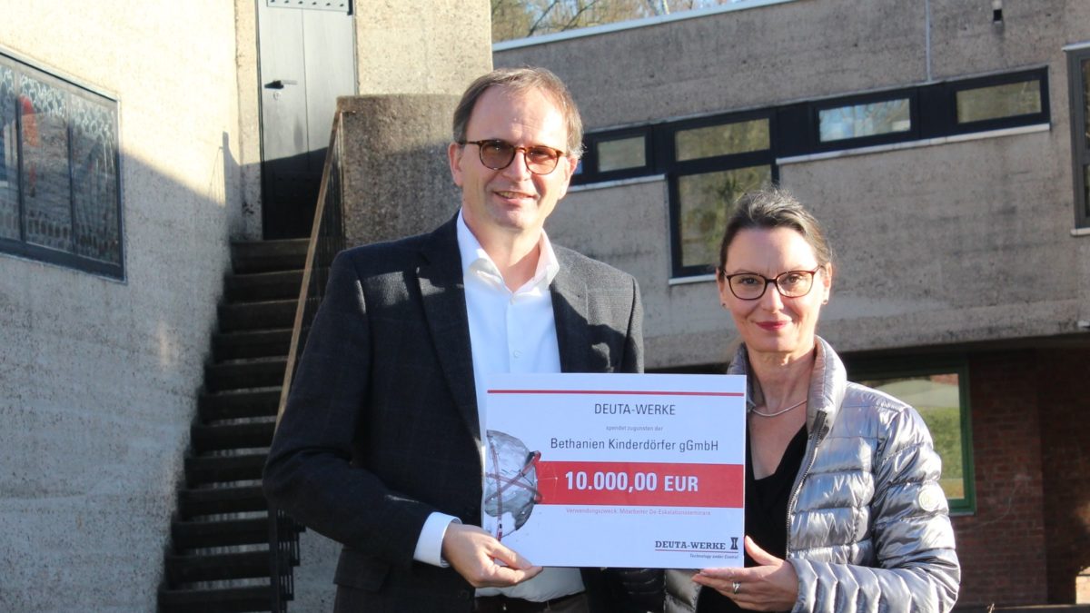 Die DEUTA-Werke in Bergisch Gladbach haben dem Bethanien Kinderdorf eine ganz besondere Weihnachtsüberraschung bereitet. DEUTA-Geschäftsführer Dr. Rudolf Ganz überreichte Kinderdorfleiterin Jutta Menne einen Scheck über 10.000 Euro. Geld, das im kommenden Jahr für eine ganz spezielle Mitarbeiterschulung verwendet werden wird. „Wir freuen uns sehr, dass die DEUTA-Werke uns so großzügig unterstützen. Denn wir wollen in 2020 allen pädagogischen Mitarbeitenden ein Deeskalationstraining anbieten“, erklärt Jutta Menne. Im Kinderdorf leben derzeit rund 120 Kinder und Jugendliche, die zum großen Teil Traumatisches erlebt haben.