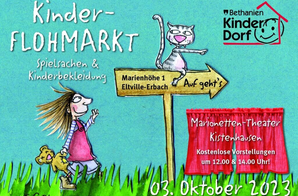 Kinderdorf-Flohmarkt am 3. Oktober von 11 bis 15 Uhr im Bethanien Kinder- und Jugenddorf, Marienhöhe 1 in Eltville-Erbach. Anmeldung unter Telefon 06123 – 6960 oder per Mail an eltville@bethanien-kinderdoerfer.de .