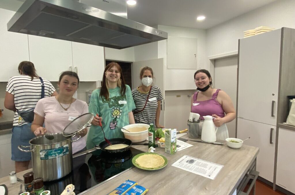 Nach einer kurzen Pause ging es dann ans gemeinsame Kochen. Vergetarisch und saisonal sollte es sein. Und so kamen Spinat und Tomaten in die selbstgemachten Pfannekuchen. Ein selbst hergestelltes Pesto machte die Spaghetti zu einem italienischen Pasta-Klassiker. Lecker es fanden die Teilnehmerinnen und freuten sich sehr über die zahlreichen Tipps und Anregungen, die sie für eigene Koch-Sessions im Haus Sonja Kill mitnehmen konnten. „Wir legen viel Wert drauf, im Kinderdorf einen nachhaltigen Umgang mit Ressourcen zu vermitteln, deshalb sind wir der Verbraucherzentrale dankbar, für diese tolle Möglichkeit, ganz praktisch an das Thema herangehen zu können“, freut sich Kinderdorfleiterin Jutta Menne über die Kooperation.