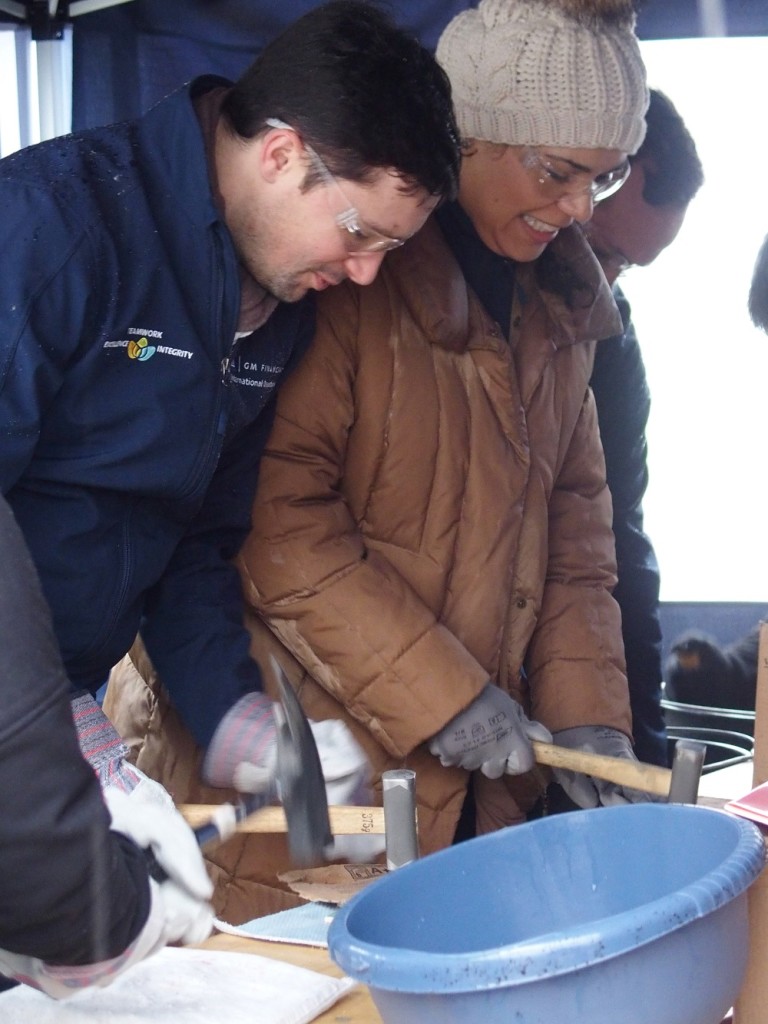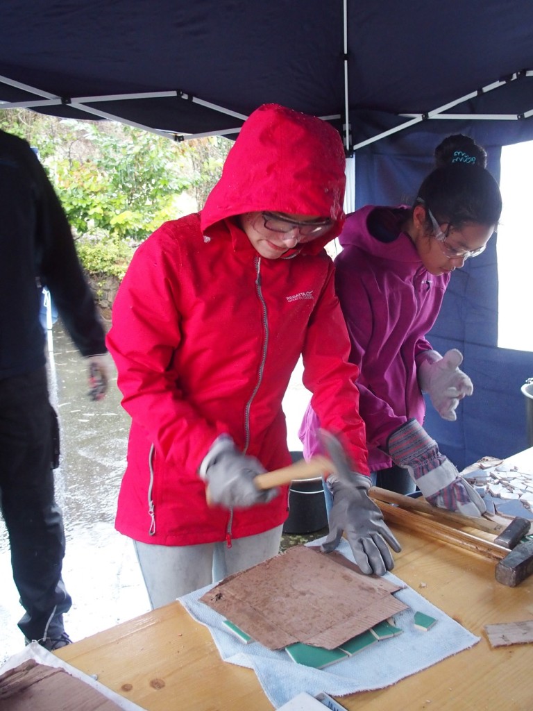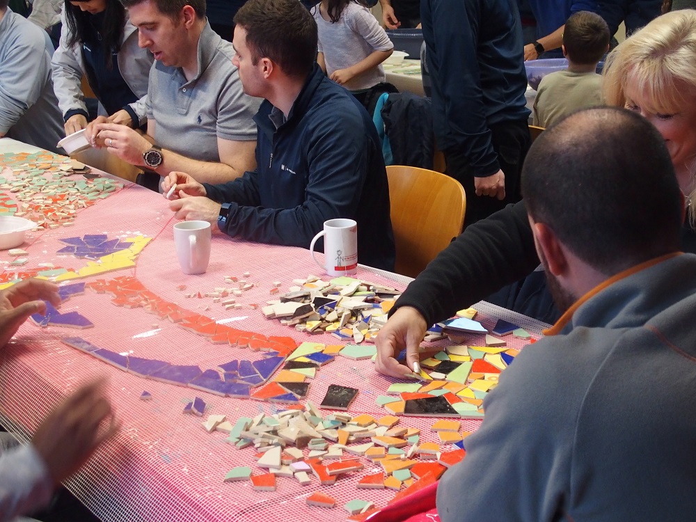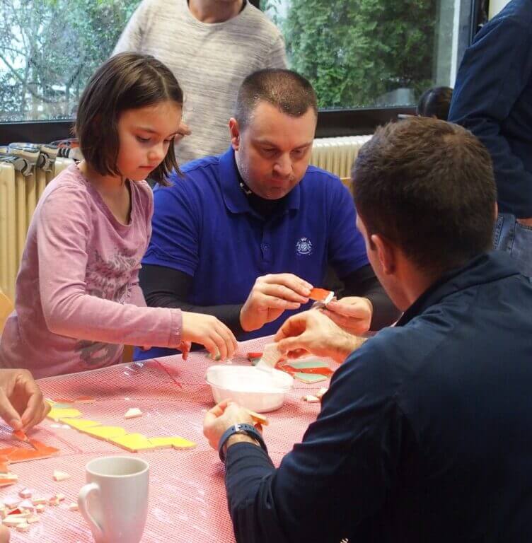Mit einem großen Reisebus kamen im kurz zuvor beginnenden Dauerregen rund 45 internationale Mitarbeiterinnen und Mitarbeiter der Opel-Bank hochmotiviert im Kinderdorf an. Nach einer kurzen Begrüßung und einem geistlichen Impuls ging es gemeinsam auf die Inlinerbahn, wo ein paar aufgestellte Pavillons die Helfer vor der nicht enden wollenden Nässe schützen. Neben der Mosaikherstellung, die mit Schutzbrillen und Hämmern ungeahnte Kräfte freisetzte, waren Tische aufgestellten, an denen die Mosaike auf Netzen vorgelegt und befestigt werden konnten. Eine meditative, wenn auch gleich herausfordernde Arbeit, denn immer das passende Mosaikteilchen zu finden, erfordert Geduld. Gegen Nachmittag kamen die Kinder und Jugendlichen aus dem Kinderdorf dazu und packten mit an. Mit Englisch, Händen und Füßen entstand schnell eine lebendige Gemeinschaft, in der die Mosaike ebenso farben- wie phantasievoll gefüllt wurden. Parallel bekamen die Mitarbeiterinnen und Mitarbeiter die Gelegenheit bei Führungen über das Gelände einen Blick hinter die Kulissen zu werfen.