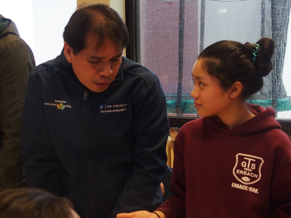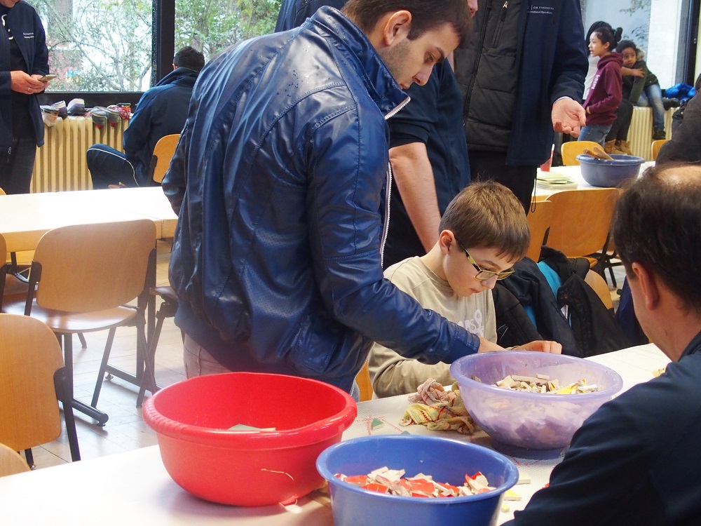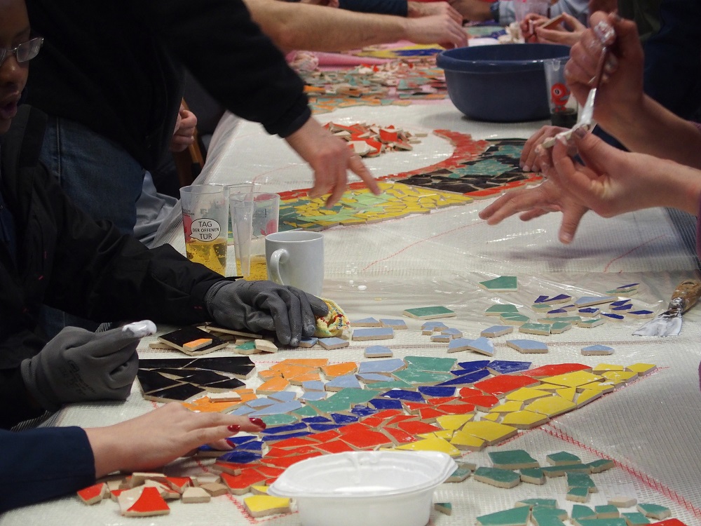 Weder Dauerregen noch Kälte störten das Miteinander, das auch nach einem spontan-Umzug nach der Halbzeit in die Aula munter weiter ging. Netz über Netz füllte sich mit den kleinen Mosaikteilchen und ganze Bilder entstanden.