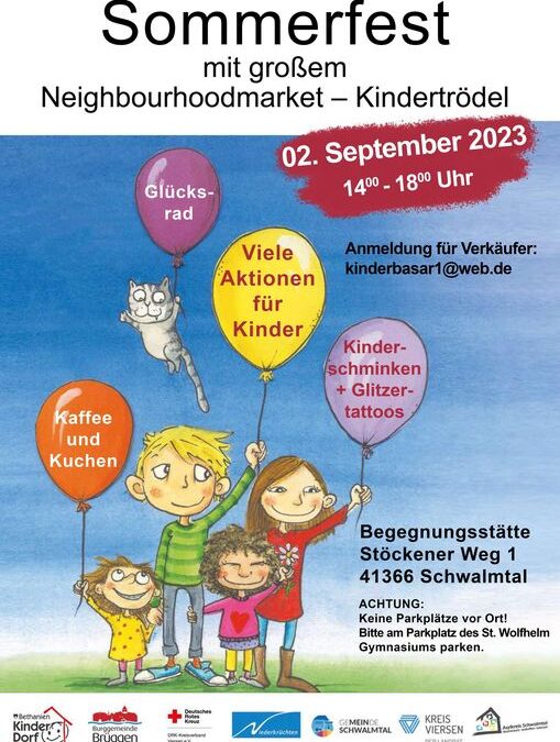 Gemeinsam mit unserem Kinderdorf, dem Asylkreis Schwalmtal und der Flüchtlingshilfe Niederkrüchten werden tolle Aktionen für Klein und Groß angeboten. Auf einem großen Neighbourhoodmarket (Kinderbasar) und dem Kreativmarkt Schwalmtal können die Besucher viele schöne Kindersachen und andere Lieblingsstücke finden. Für das leibliche Wohl wird selbstverständlich auch gesorgt.
